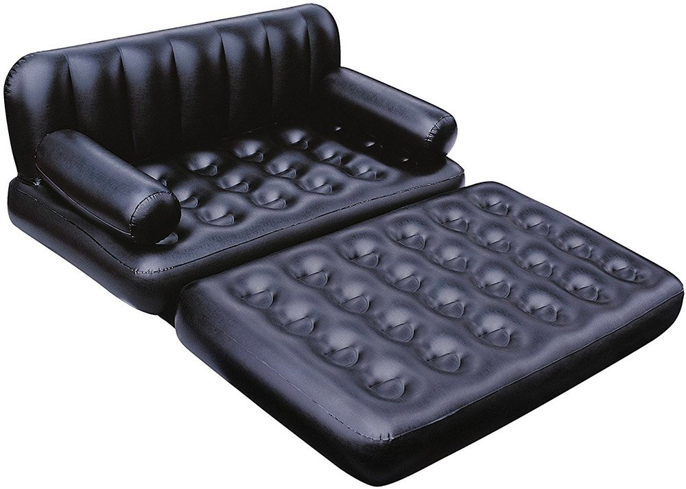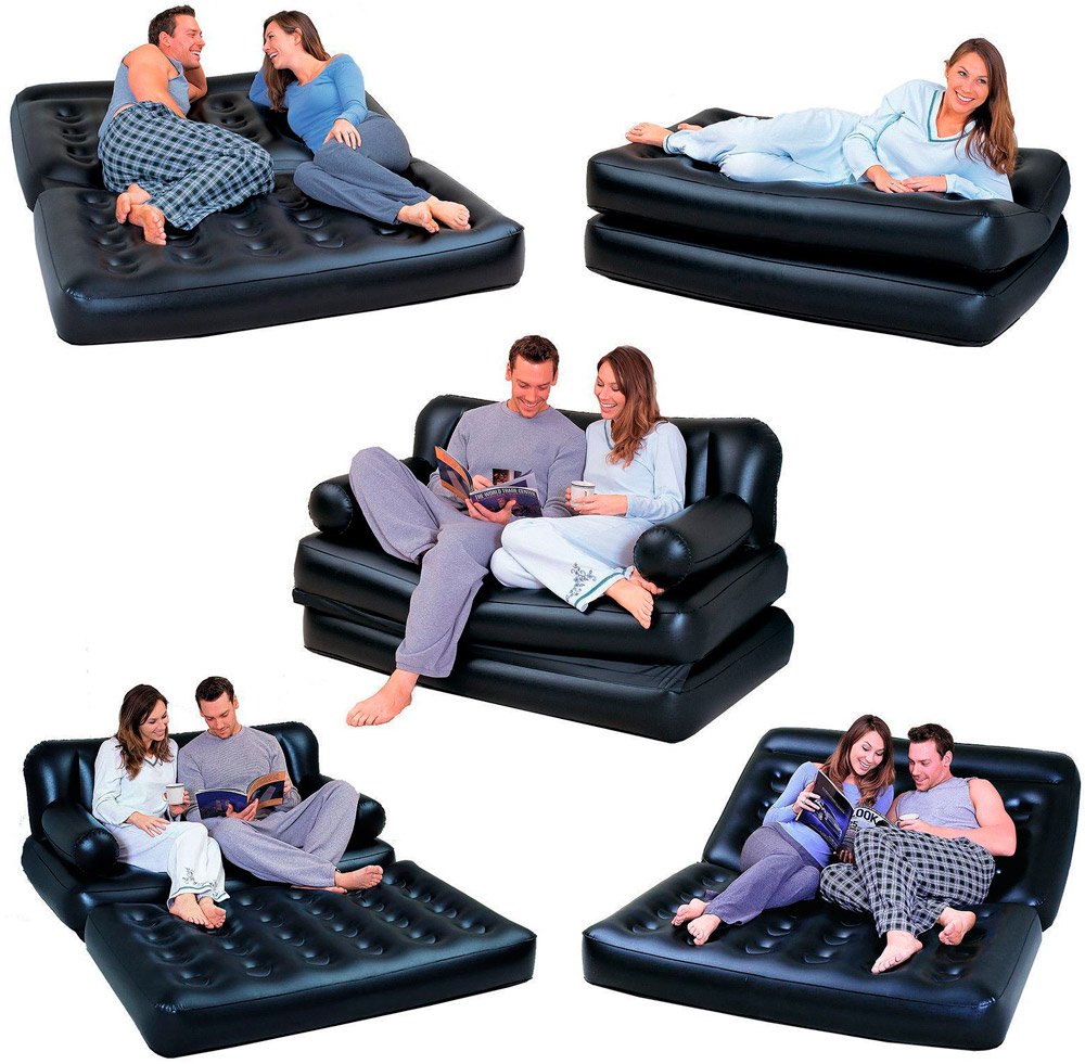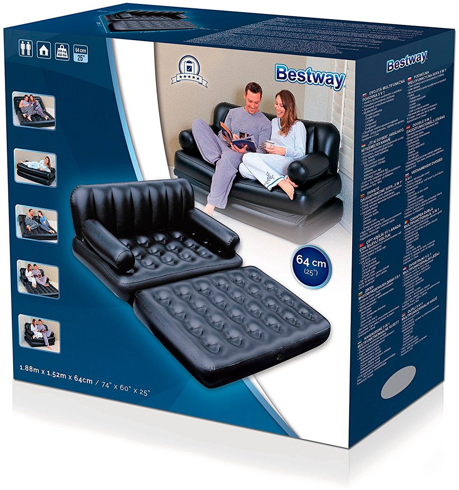 Надувной диван-трансформер из прочного винила. 5 положений для различных вариантов использования: диван, кровать с изголовьем, низкая кровать, высокая кровать, шезлонг. Универсальный клапан для накачивания и сдувания - подойдет любой тип насоса. Самоклеящаяся заплатка для ремонта в комплекте. Максимальная нагрузка: 295 кг. Размеры: 188x152x64 см.