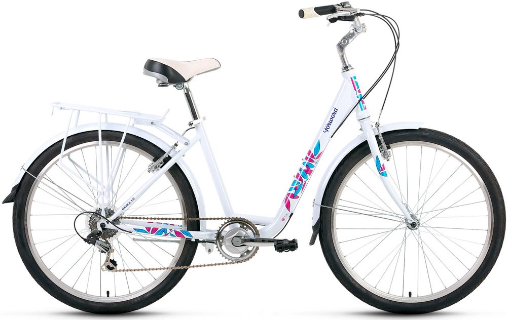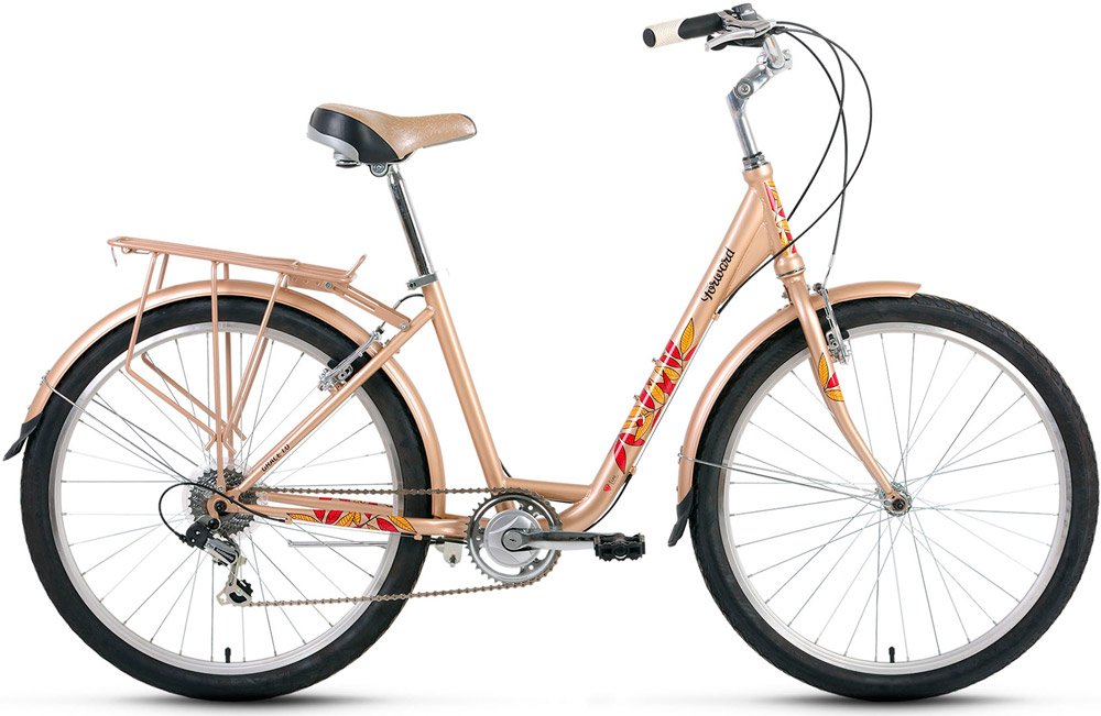 Городской, женский, без амортизации, материал рамы - сталь, колеса - 26 ", трансмиссия 7 скор, Тормоза: передний - ободной, задний - ободной.