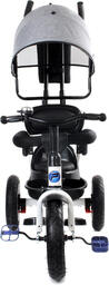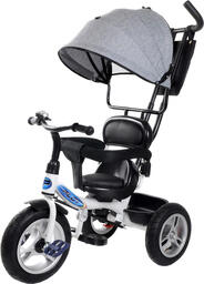 Трехколесный велосипед для детей 1-4 лет. Надувные колеса: 12 и 10 . Цельнометаллическая рама. Фиксация задних колес. Поворотное сиденье на 180 градусов. Сиденье с мягкими вставками. Колясочная крыша - опускается, поднимается, снимается. Складная подножка. Ремни безопасности. Функция быстрого снятия колеса.