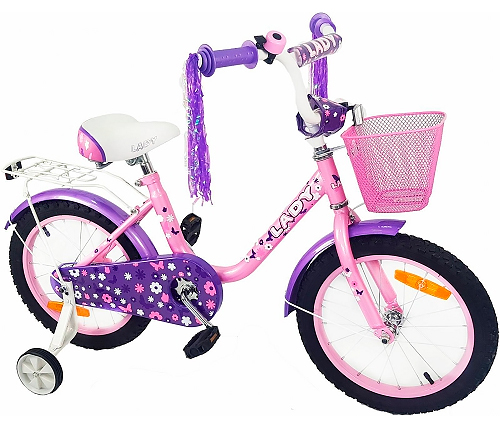 Двухколесный велосипед для девочек 5-8 лет. Стальная рама. Жесткая вилка. Надувные колеса, 18 . 1 скорость. Регулируемые седло и руль. Задний ножной тормоз. Алюминиевые обода. Руль с подъемом. Приставные колеса. Защита цепи. Пластиковые педали. Багажник. Крылья. Звонок. Мишура на грипсах. Корзина на руле. Цвет: розовый/фиолетовый.