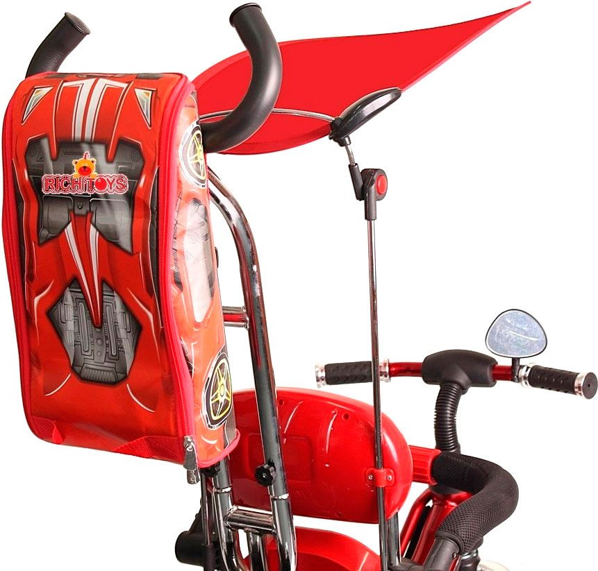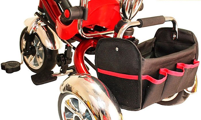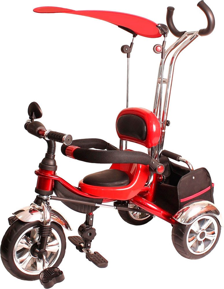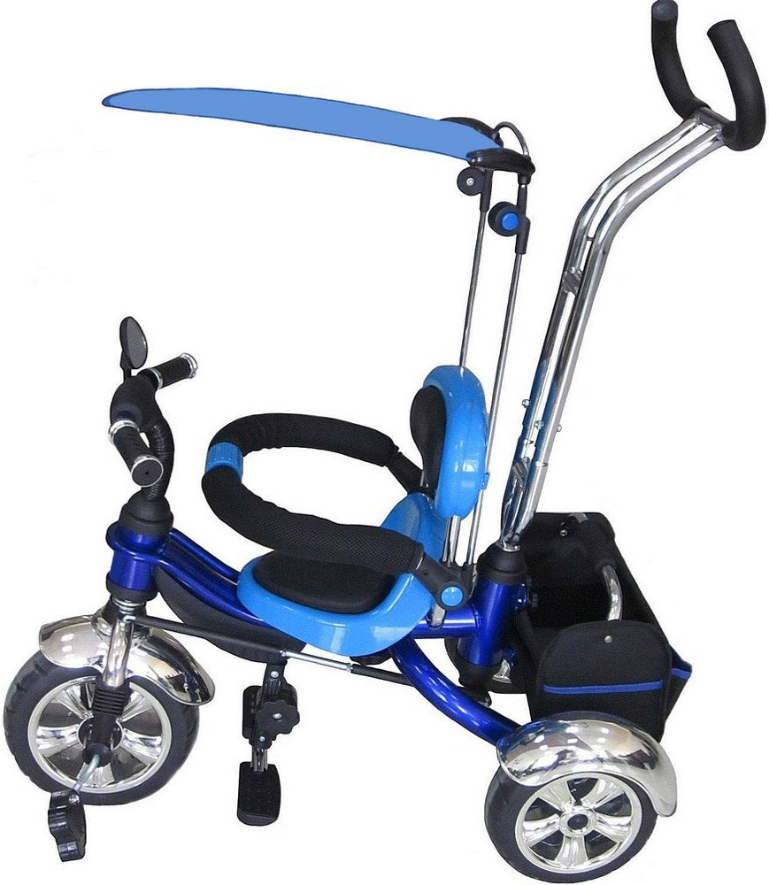 Трехколесный велосипед для детей 1-3 лет. Широкие колеса ПВХ с протектором (10" и 8"). Мягкое сиденье с фиксированной спинкой. Регулировка сиденья по горизонтали. Страховочный обод. Складная подножка. Двойная ручка управления. Солнцезащитный козырек-тент. Нижняя багажная корзина. Хромированные крылья. Зеркало заднего вида. Вес: 10 кг. Различные цветовые варианты.