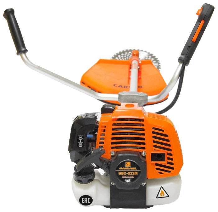 Бензиновый, Мощность 1100 Вт, объем двигателя 33 см3, металлический нож, леска, диаметр лески 2.4 мм, ширина кошения ножом 23 см, вес 7.3 кг.