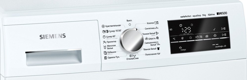 Отдельно стоящая стиральная машина; барабанного типа; фронтальная загрузка; 9 кг; количество программ 15; класс энергопотребления А+; материал бака пластик; индикация ошибок, отложенный старт; контроль пенообразования, контроль дисбаланса, защита от протечек, защита от детей; ширина 59.8 см.