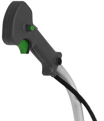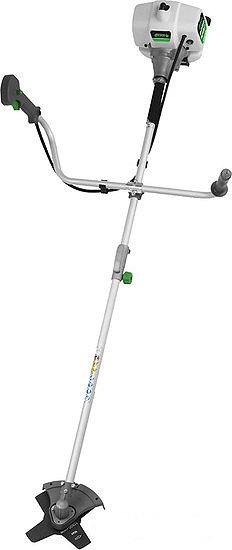 Бензиновый, объем двигателя 43 см3, леска, металлический нож, ширина кошения леской 44 см, вес 7.3 кг.