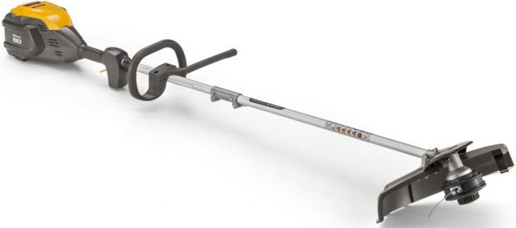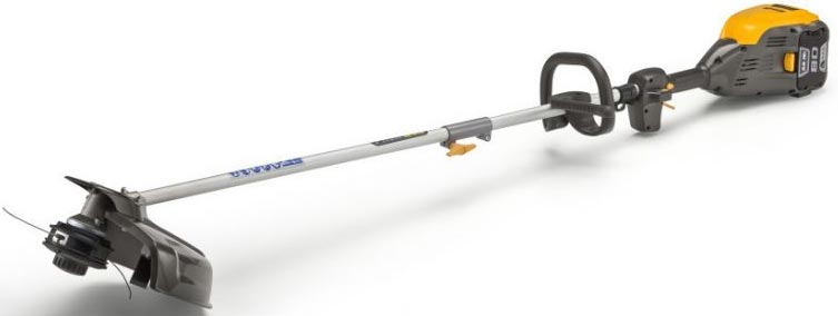 Аккумуляторный, леска, металлический нож, диаметр лески 2 мм, ширина кошения леской 40 см, ширина кошения ножом 25.5 см, вес 6.5 кг.