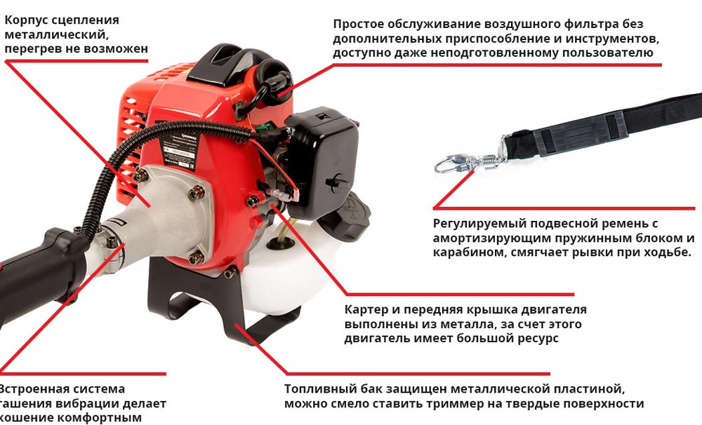 Бензиновый, Мощность 750 Вт, объем двигателя 25 см3, леска, диаметр лески 2 мм, ширина кошения леской 35 см.