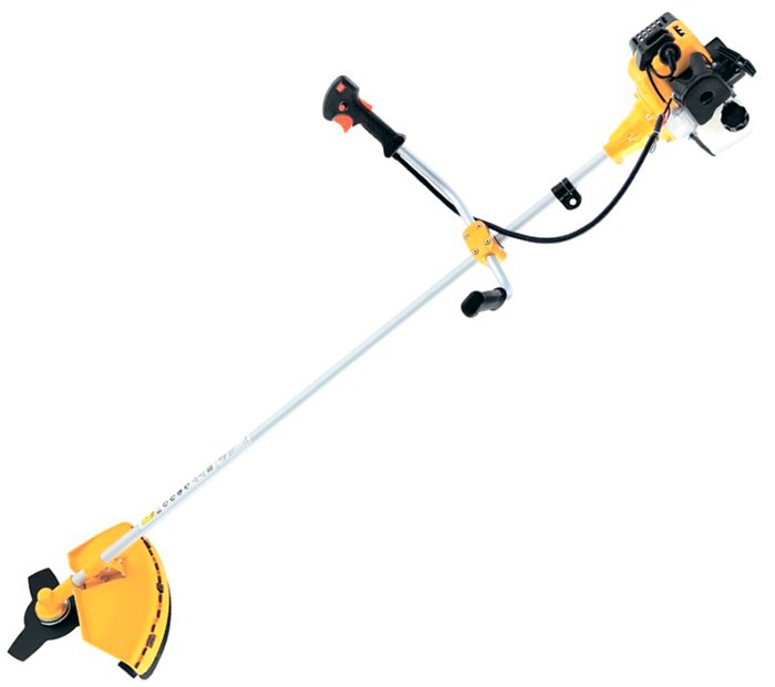 Бензиновый, Мощность 1300 Вт, объем двигателя 42.7 см3, металлический нож, леска, ширина кошения леской 43 см, ширина кошения ножом 25.5 см, вес 9.3 кг.