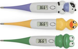 Электронный термометр. Не содержит ртути. Яркий дизайн. Съёмная насадка-держатель. 1000 измерений от одного нового элемента питания (LR 41). С гибким нетравмирующим наконечником. Среднее время измерения 60 секунд. Автоматическое отключение. Память последнего измерения. Информативный звуковой сигнал. Влагозащита датчика. Точность измерения +/0.1°С. Футляр в комплекте.