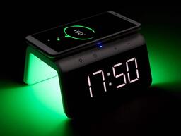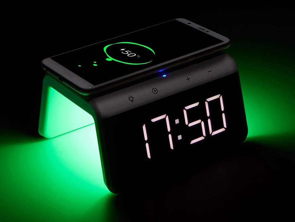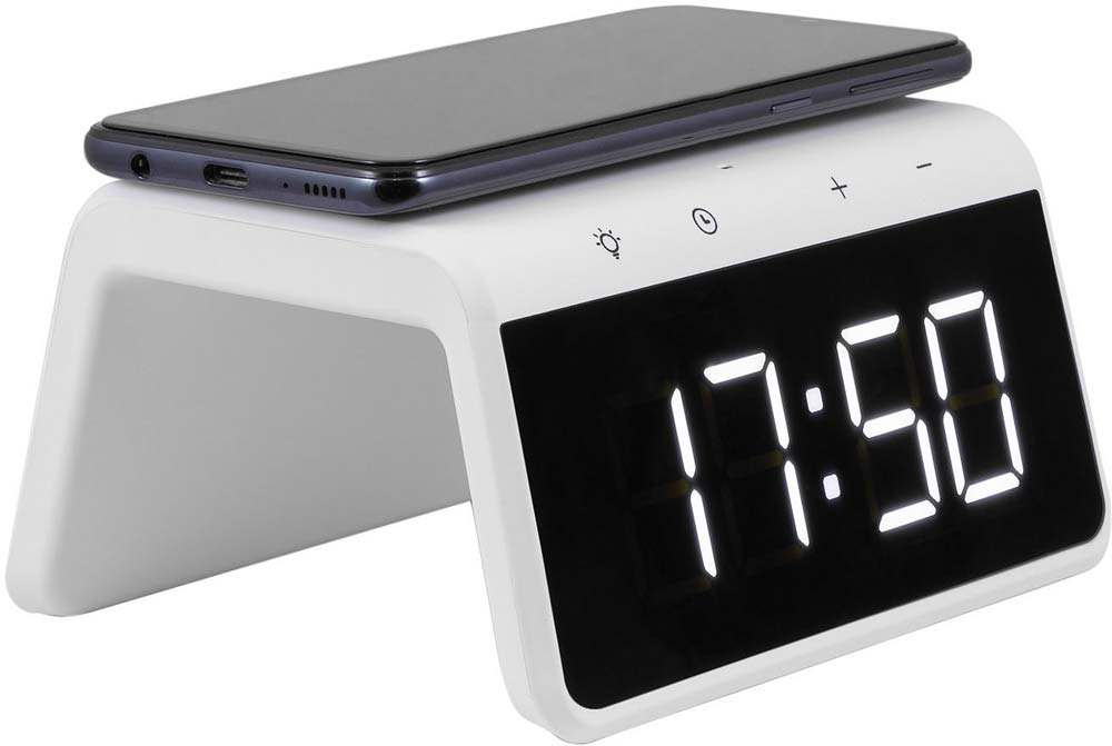Будильник, светильник, функция зарядного устройства, беспроводное зарядное устройство, USB, питание от сети.