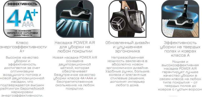 • Насадки ковер/пол (2 positions POWER AIR), щелевая, мебельная, паркетная