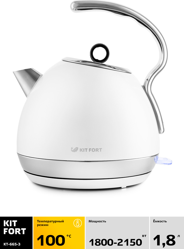 Электрический чайник, мощность 2150 Вт, объем 1.8 л, материал корпуса нерж. сталь, нагревательный элемент закрытая спираль, дополнительные функции: индикация включения, подставка с вращением на 360°.