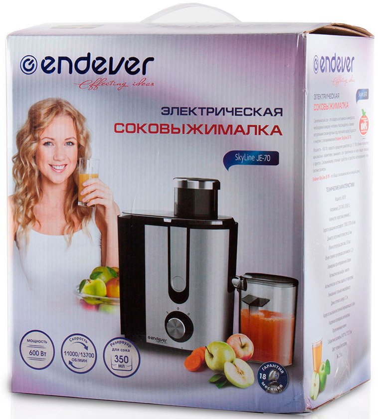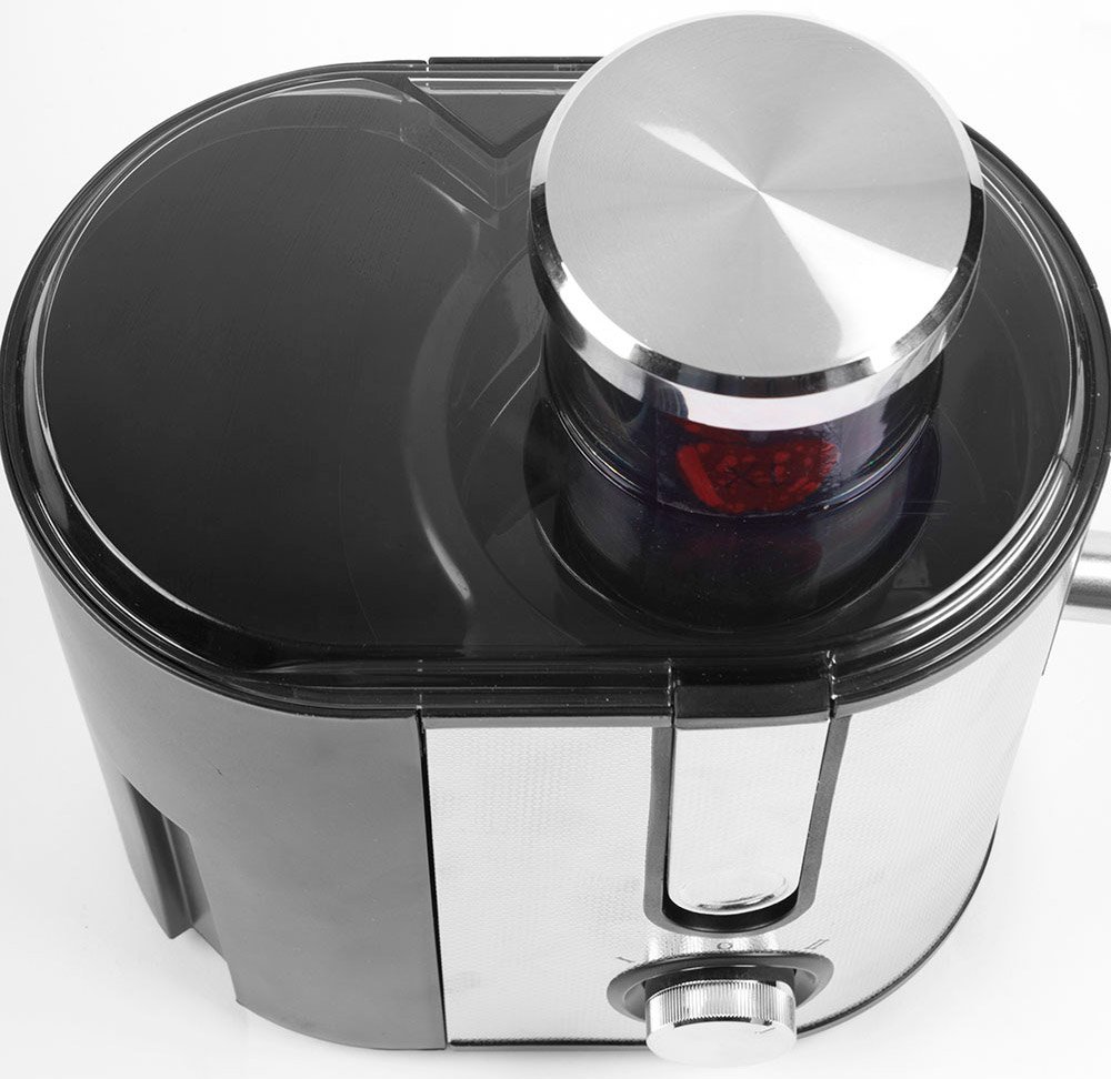 Центробежная соковыжималка; мощность 600 Вт; количество скоростей 2; объём резервуара для сока 0,35 л; объём резервуара для мякоти 1,2 л; выброс мякоти автоматический; диаметр загрузочного отверстия 63 мм; материал корпуса нерж. сталь; прямая подача сока; система блокировки; пеноотсекатель.