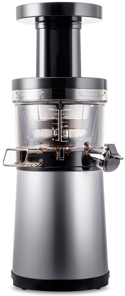 Шнековая соковыжималка; мощность 150 Вт; количество скоростей 1; объём резервуара для сока 0.5 л; выброс мякоти автоматический; материал корпуса нерж. сталь; прямая подача сока; система блокировки.