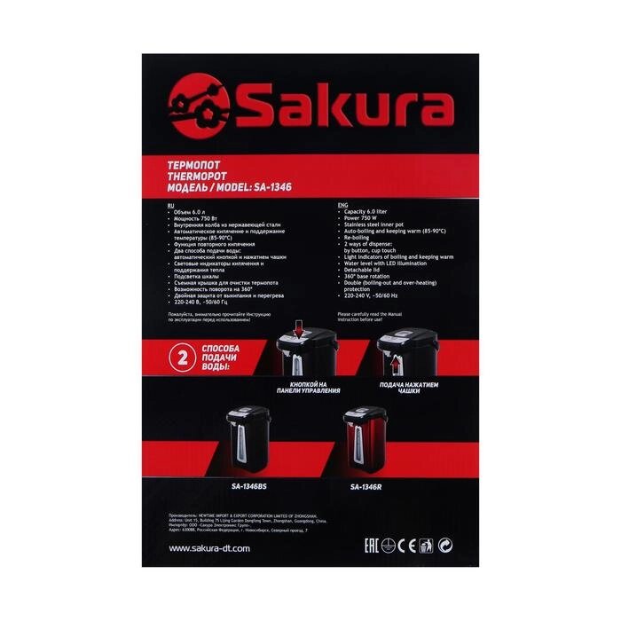 Термопот Sakura SA-1346BS, 6 л, 750 Вт, 2 способа подачи воды, чёрный