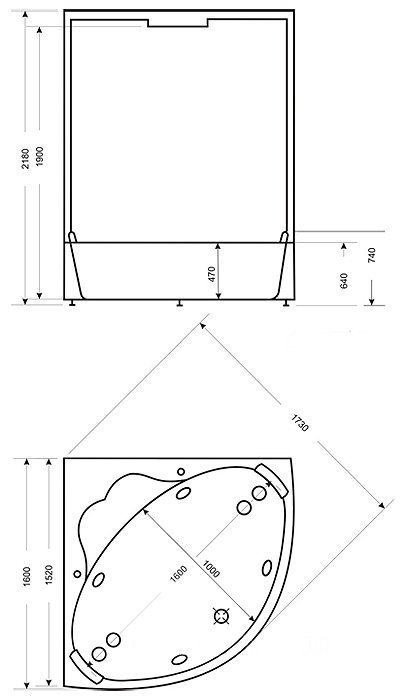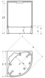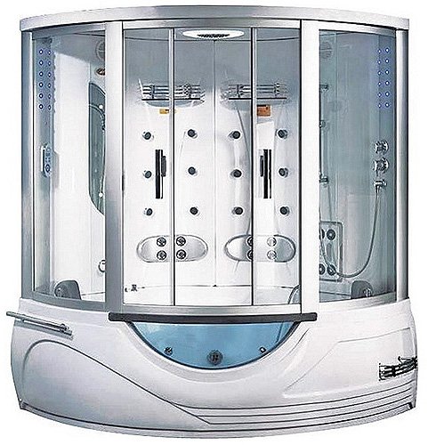 Душевой бокс с гидромассажем размером 160 х 160 х 218 см. Массаж стоп, спины, голени. Тропический душ. Турецкая баня. Аромотерапия. Озонотерапия. Система дезинфекции. Электронная панель управления. Температурный датчик. Подводный фонарь. Раздвижные двери из прозрачного стекла. Два подголовника. Зеркало.