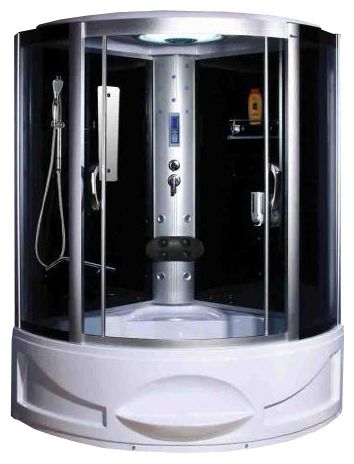 Душевой бокс размером 1200x1200x2150 мм. Угловая конструкция, форма четверть круга. Акриловый поддон высотой 50 см, закаленное тонированное стекло стенок толщиной 5 мм, алюминиевый профиль, раздвижные двери. Вертикальный гидромассаж 8 форсунок, массаж ног, верхний душ (тропический ливень), ручной душ.