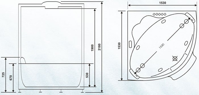 Душевой бокс размером 146х146х215 см. 20 гидромассажных форсунок. Акриловый поддон. Многофункциональный и верхний душ. Паровая баня. Гидромассаж стоп. Точечный массаж. Гидромассаж поясничного пояса. Вентилятор. Дезинфекция. Аварийная система (УЗО). Регулятор температуры. Установка времени. Верхний и декоративный свет.