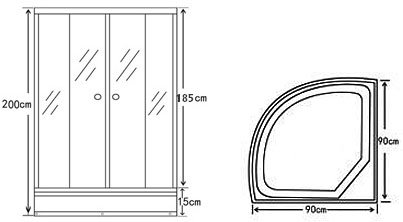 Душевой угол размером 90 х 90 х 200 см. Раздвижные двери из закаленного стекла толщиной 5 мм. Акриловый поддон высотой 15 см на стальной раме с регулируемыми ножками. Белый стальной профиль.