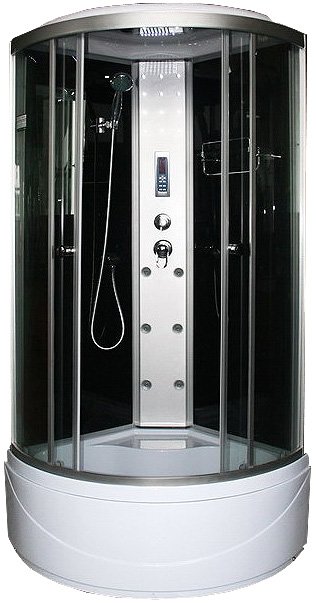 Душевая кабина с гидромассажем размером 90 х 90 х 215 см. Поддон со съемным экраном. Раздвижные двери из тонированного стекла. Тропический ливень. Ручной душ. Верхняя подсветка. Вентиляция. Электронная панель управления. Телефон. Радио. Полки. Шланги на горячую и холодную воду в комплект не входят.
