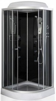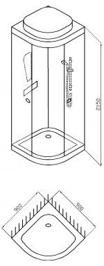 Гидромассажная душевая кабина размером 90 х 90 см, высотой 215 см. Невысокий акриловый поддон, стенки из калёного стекла толщиной 4 мм. 6 гидромассажных форсунок, смеситель, ручной душ, верхний душ (тропический ливень). Панель управления, лампа, радио, вентилятор.
