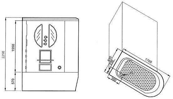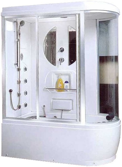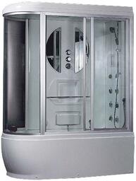 Душевой бокс с гидромассажем размером 170 х 83 х 225 см. Гидромассаж в ванне: 6 форсунок. Гидромассаж спины: 8 форсунок на панели. Гидромассаж стоп. Турецкая баня. Тропический ливень. Вентиляция. Хромотерапия. Электронная панель управления. Подсветка в ванне. Радио. Полки. Откидное сидение из дуба с водоотталкивающим покрытием.