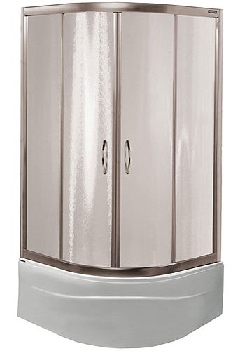 Душевой угол с входом по центру. Раздвижные двери. Стекло с узором. Поддон глубиной 23 см с переливом. Размеры (см): 90 х 90 х 185 (без поддона).
