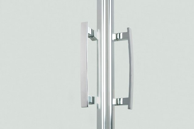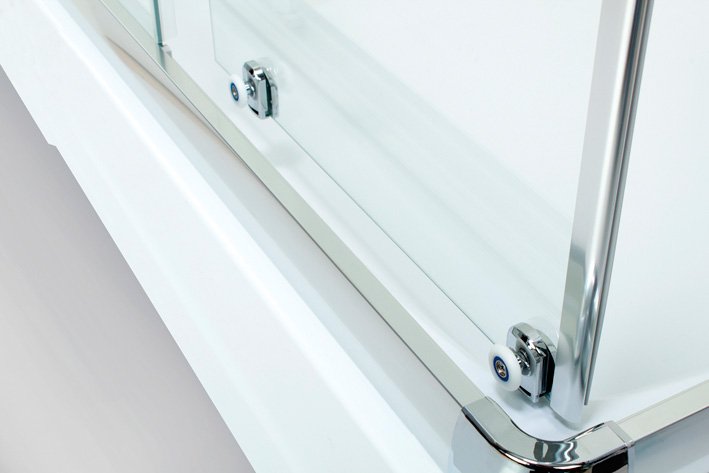 Душевой угол размером 90х90х190 см. Угловая конструкция. Стеклянные стенки толщиной 5 мм, раздвижные двери. Ширина входа 53 см.
