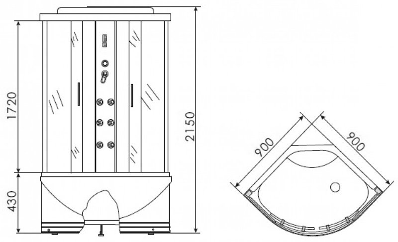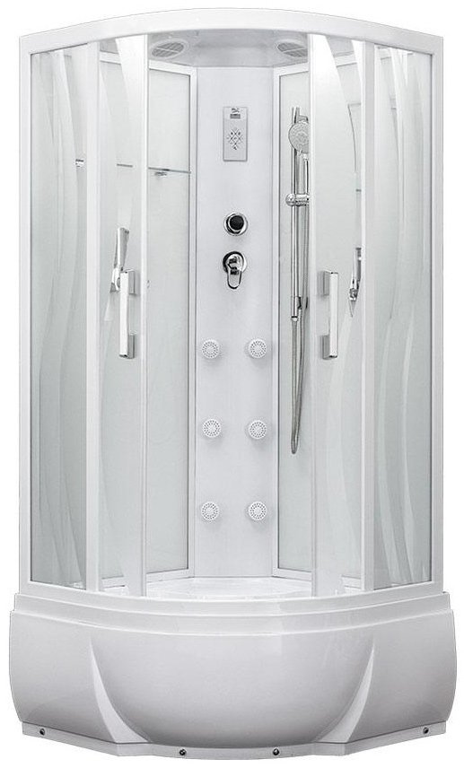 Душевая кабина 900x900x2150 с гидромассажем. Раздвижные двери из ударопрочного стекла с рисунком толщиной 5 мм. Высокий поддон. Тропический душ, ручной душ, зеркало, полочка, сиденье. Гидромассаж спины 6 форсунок. Верхнее освещение. Пульт управления. Вентиляция. FM-радио. Дозатор для жидкого мыла, крючки-вешалки, рейлинг для душа-лейки.
