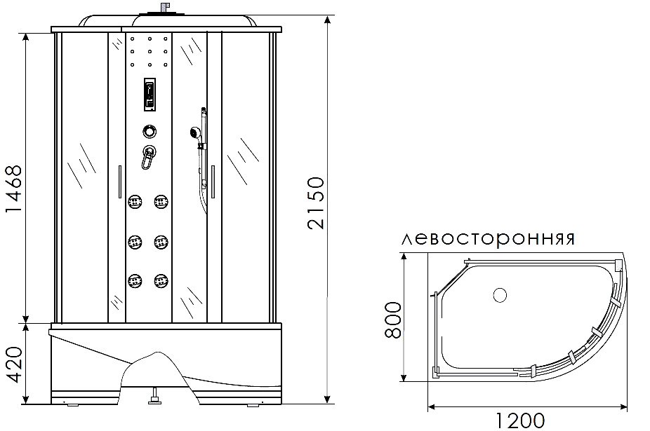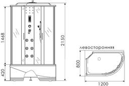 Душевая кабина 1200x800x2150 с гидромассажем. Раздвижные двери из ударопрочного матового стекла толщиной 4 мм. Высокий поддон. Тропический душ, ручной душ, зеркало, полочка, сиденье. Гидромассаж спины 6 форсунок. Верхнее освещение. Пульт управления. Вентиляция. FM-радио. Лунный свет на стойке. Рейлинг для душа-лейки.