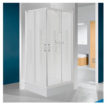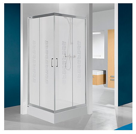 Душевой угол размером 90х90х190 см. Угловая конструкция. Стеклянные стенки толщиной 4 мм, раздвижные двери. Ширина входа 53 см.