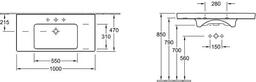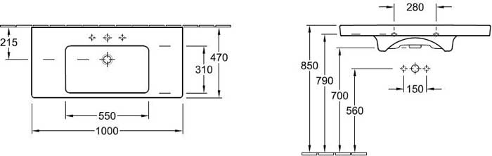 Умывальник на тумбу, на пьедестал, на кронштейны, ширина 1000 мм, длина 470 мм, форма: прямоугольная, санитарная керамика, отверстие под смеситель, отверстие под перелив.