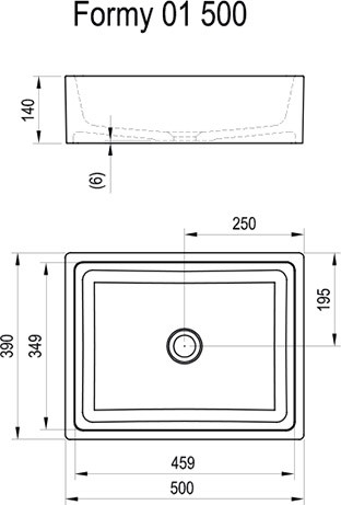 Умывальник на столешницу, ширина 500 мм, длина 390 мм, форма: прямоугольная.