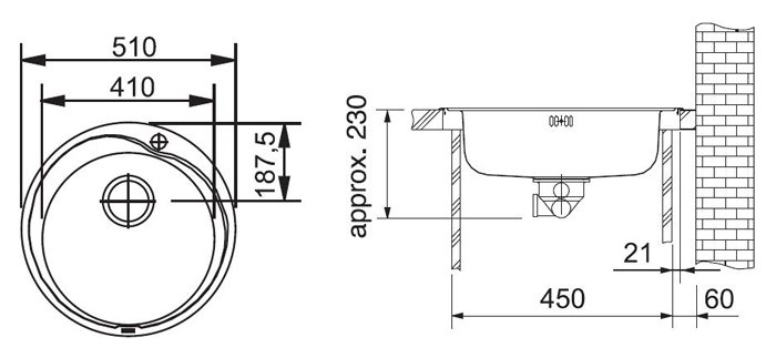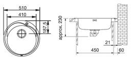 Способ установки врезная; форма круглая; материал нерж. сталь; количество чаш 1; ширина 51 см; длина (диаметр) 51 см; глубина основной чаши 18 см.
