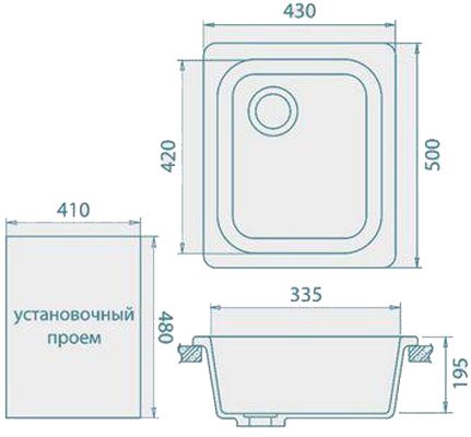 Способ установки врезная; форма прямоугольная; материал искусст. гранит; количество чаш 1; ширина 50 см; длина (диаметр) 43 см; глубина основной чаши 19.5 см.