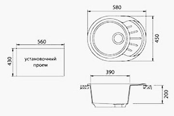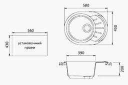 Способ установки врезная; форма овальная; материал искусст. гранит; количество чаш 1; ширина 58 см; длина (диаметр) 45 см; глубина основной чаши 20 см.