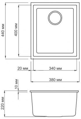 Способ установки врезная; форма прямоугольная; материал искусст. гранит; количество чаш 1; ширина 38 см; длина (диаметр) 44 см; глубина основной чаши 22 см.