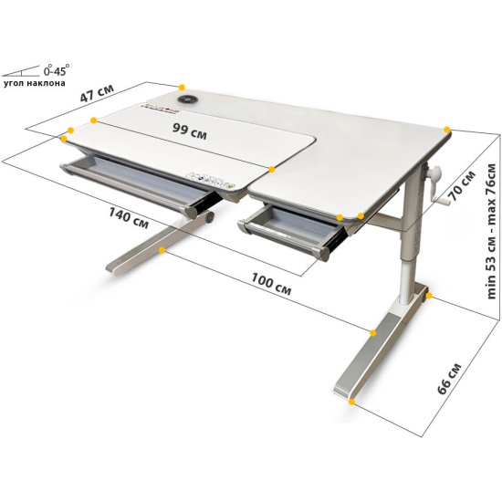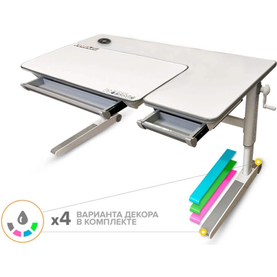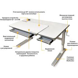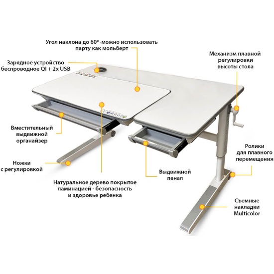 1. В столы серии Energy от Mealux интегрирована современная беспроводная зарядка Wireles Changer. Если ваш смартфон имеет встроенные приемники индукционных волн, вам нужно всего лишь приложить телефон (или планшет) на панель и зарядка активируется автоматически. Мощность беспрводной зарядки 10 w. Если же нет такой функции у девайсов – не расстраивайтесь! Под защитной водонепроницаемой накладкой находится два разъема – USB А (USB 5V 2.4А) и Type C (USB-C 5V 3A) для подключения к зарядке. 2. Детский стол Mealux Sherwood XL Max Multicolor - максимальная комплектация стола Sherwood XL.Преимущества данного стола: столешница из натурального дерева твердолиственных пород, которая покрыта защитной ламинацией; кромка вдоль всей столешницы изготовлена из экологически чистого и безопасного материала и зафиксирована без применения клея. 3. Еще одной осбенностью стола является возможность менять цветные накладки, которые идут сразу в комплекте. Всего доступно 4 варианта декора: серый, голубой, розовый и зеленый. Вы можете заменить накладки на ножках и выдвижном деревянном ящике. Кроме того, можно создавать собственный дизайн вашего стола, комбинируя различные накладки разных цветов между собой.4. Угол наклона рабочей части столешницы регулируется в диапазоне 0-45 градусов. Поэтому, столешницу можно установить в оптимальном положении для письма, чтения и творчества. Плавность регулировки угла наклона обеспечивает качественный механизм газ-лифт. Регулировка осуществляется специальным рычажком, который расположен с левой стороны столешницы. 5. Высота стола варьируется в диапазоне 53-76 см, поэтому данный стол отлично подойдет для дошкольника и будет "расти" вместе с ребенком. Высота регулируется специальной механической ручкой. При необходимости ручку можно снять. Также, каждые 30-40 минут можно чередовать положение сидя-стоя во время выполнения занятий.6. Под подвижной частью столешницы расположен вместительный выдвижной органайзер с разделителями. Пенал изготовлен из прочного и безопасного пищевого ABS-пластика. 7. Массивные металлические ножки стола дополнены специальными регулировочными мебельными опорами для обеспечения его устойчивости. А также, на ножках есть колесики для удобного перемещения стола по комнате. 8. Бонус - металлический крючок, на котором можно разместить рюкзак, сумку и тд.