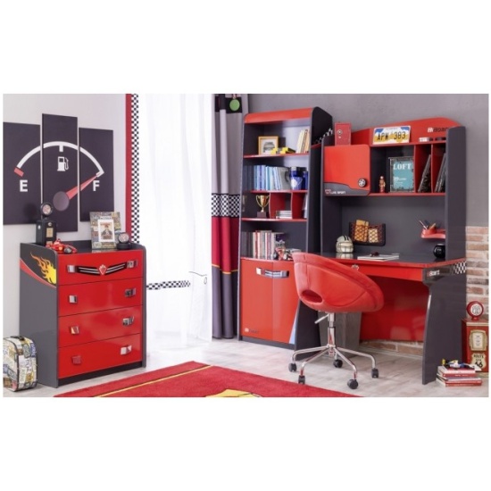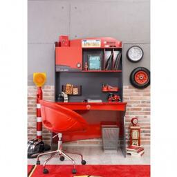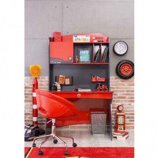 По-настоящему крутая надстройка к столу для мальчиков. Выполнена в гоночном стиле: красно-черные тона, подставки, выполненные в стиле салона автомобиля, украшения в виде колес, спортивные надписи и языки огня.