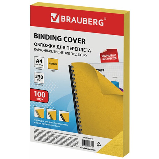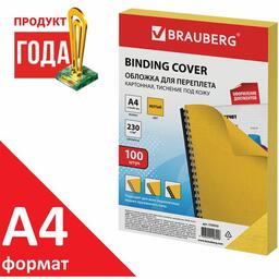 Обложки для переплета BRAUBERG придадут документам эстетичный внешний вид и защитят от повреждений. Предназначены для переплета документов брошюровщиком с помощью пластиковых и металлических пружин. Актуальны для создания деловых брошюр.Выполнены из прочного, износостойкого картона желтого цвета и плотностью 230 г/м2. Тиснение под кожу. Подходят для документов формата А4. 100 штук в комплекте.