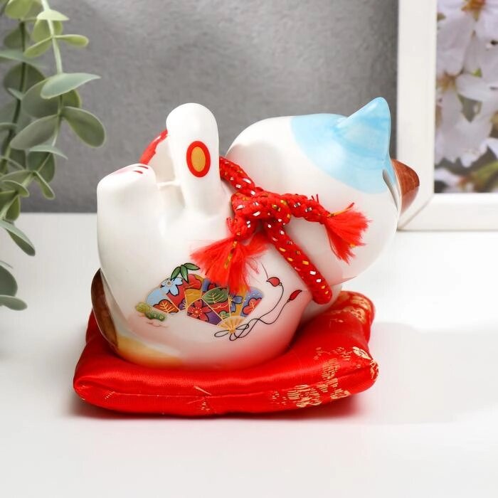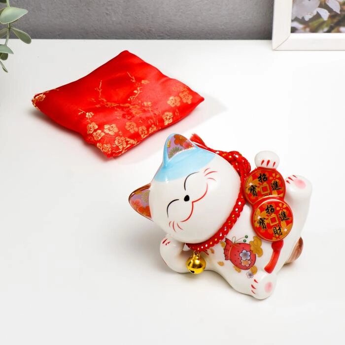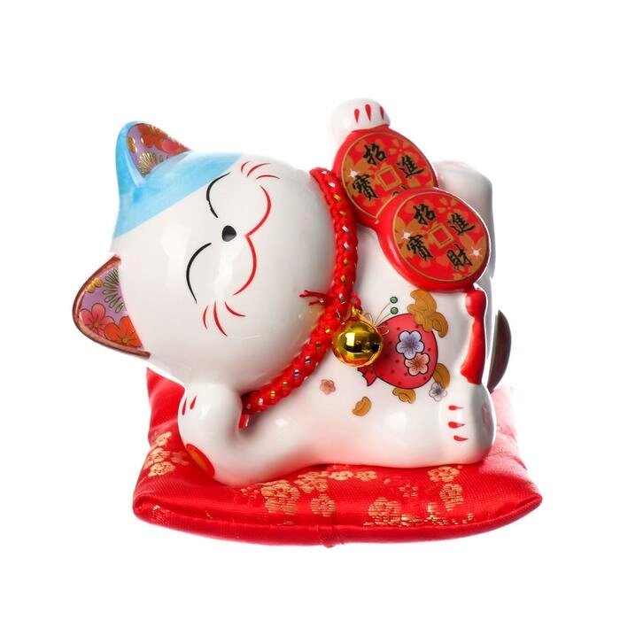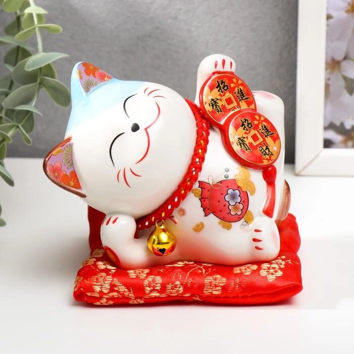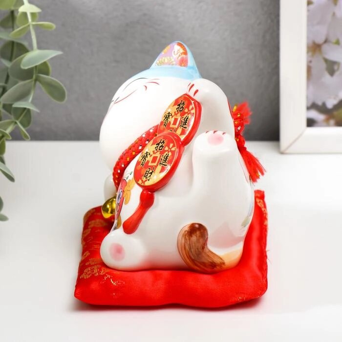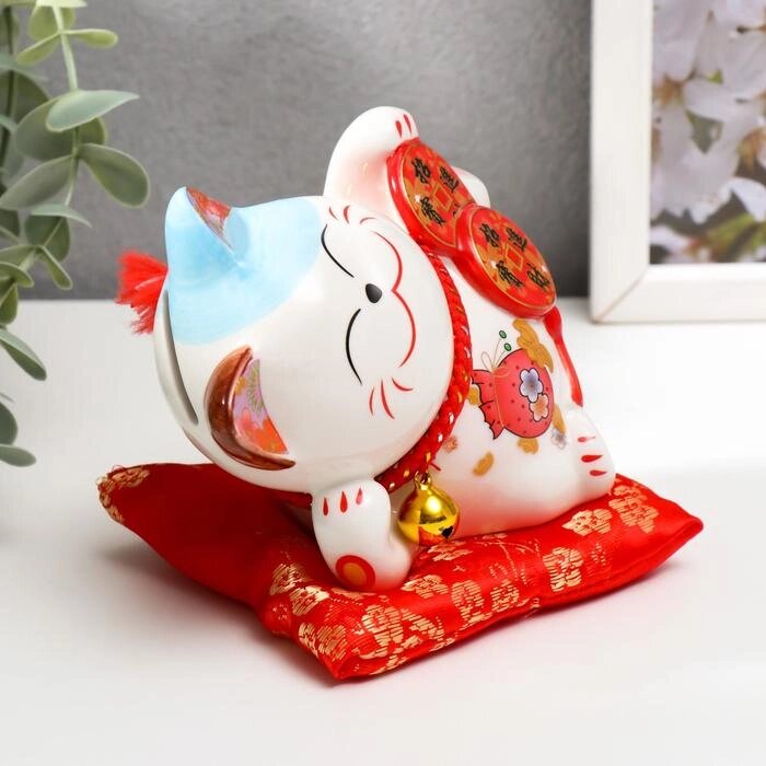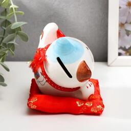 Копилка керамика "Кот Манэки-нэко с монетками на коврике" 10х12,5х7 см