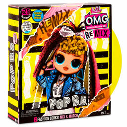 Музыкальная фэшн дива LOL OMG Remix в стиле музыки 80-х по имени Pop B.B. Кукла высотой 25 см прячется в необычной упаковке – музыкальном боксе, который воспроизводит музыку, а также является головоломкой – нужно будет собрать куплеты песни. Pop B.B. с разноцветными прядями волнистых волос и бирюзовыми глазами одета в короткий топ, джинсовую куртку и ажурную белую юбку, на ногах колготки в сеточку и ботинки. Музыкальный инструмент – бубен.