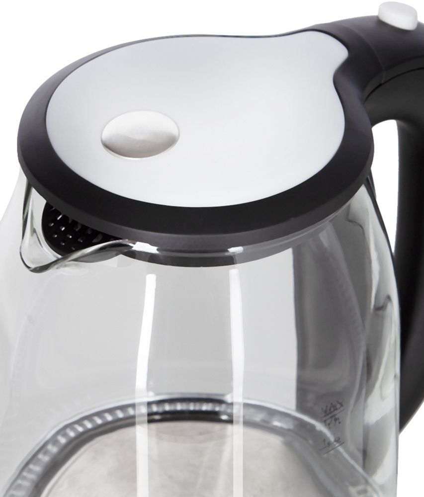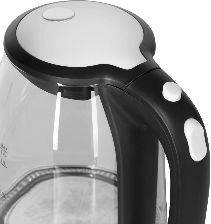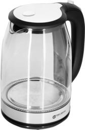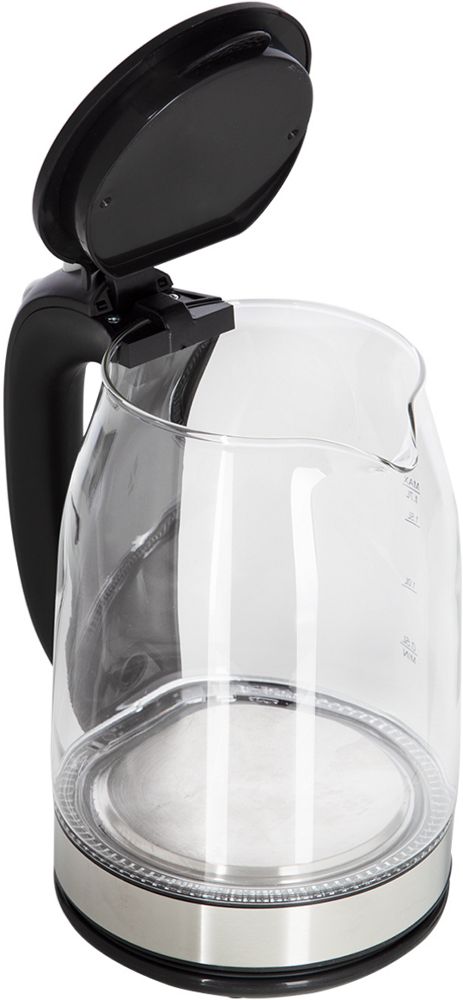 Электрический чайник, мощность 1500 Вт, объем 1.7 л, материал корпуса металл/стекло, нагревательный элемент закрытая спираль, дополнительные функции: подсветка воды, индикация включения, подставка с вращением на 360°.