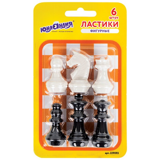 Ластики фигурные ЮНЛАНДИЯ "Шахматы" выполнены в форме шахматных фигур, что позволяет превратить процесс стирания в игру. Подходят для удаления надписей, сделанных чернографитными карандашами.Набор из шести высококачественных ластиков, изготовленных из термопластичной резины. Поставляются в черно-белых цветах и имеют форму шахматных фигур. Отверстие внизу ластика позволяет надеть его на карандаш, таким образом ластики-шахматы всегда будут под рукой. Упаковка - блистер с подвесом.