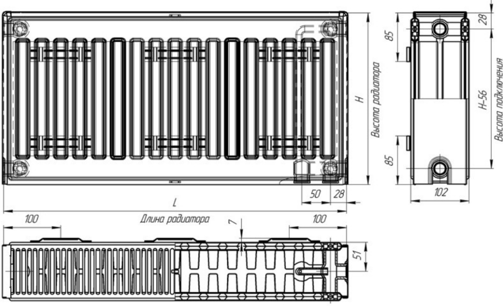 Стальной радиатор, панельный, подводка теплоносителя боковая, нижняя, тепловая мощность 1234 Вт.