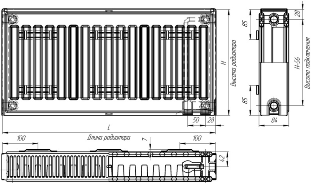Стальной радиатор, панельный, межосевое расстояние 444 мм, подводка теплоносителя боковая, нижняя, тепловая мощность 3446 Вт.