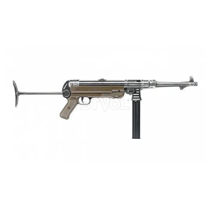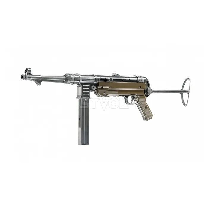 Пневматична копія Легендарного пістолета-кулемета часів Другої Світової Війни, МР40 від німецької компанії Umarex. Живиться від двох 12-грамових балончиків CO₂ і вміщує 50 сталевих BB кал. 4,5мм. в магазині. Функція імітації ходу затвора (Blowback) в поєднанні з повністю автоматичним режимом вогню, справді вражають. Ця модель має складний приклад і ствольну коробку спеціально "зістареного" кольору.