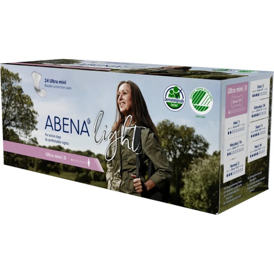 Abena Light – серия урологических прокладок анатомической формы премиум-класса для пациентов с разной степенью недержания: от легкого капельного до тяжелого.Abena Light Ultra Mini – самый маленький продукт в ассортименте Abena Light. Данная прокладка подходит для людей, которые время от времени страдают капельным недержанием мочи.Ультратонкие – комфортно носить, не стесняют движений.Клеевая полоска надёжно фиксирует прокладку на белье.Система Top Dry обеспечивает мгновенное впитывание и распределение жидкости.Суперабсорбент предотвращает появление неприятных запахов.Полностью «дышащие», благодаря внешнему покрытию.Без запаха и хлорного отбеливания, не содержит фталатов.Длина прокладки: 20 см.Продукция отмечена скандинавским знаком качества Белый Лебедь.Важно понимать, что урологические прокладки предназначены для впитывания мочи, а не крови. Нетканая мембрана верхнего слоя легко пропускает жидкость, в то время как более крупные молекулы белка могут оставаться на поверхности прокладки, вызывая дискомфорт и раздражение кожи. Поэтому Abena не рекомендует использовать урологические прокладки вместо гигиенических во время менструации."