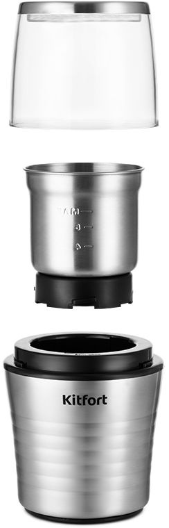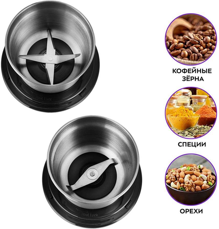 ОсобенностиКофемолка укомплектована двумя съёмными чашами: чашей для кофе и чашей для специй. В чаше для кофе установлен 2-лезвийный нож для эффективного помола зёрен кофе, а в чаше для специй – 4-лезвийный нож для измельчения.