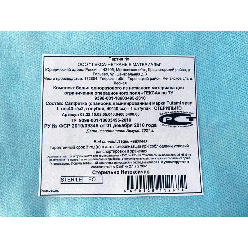 Салфетка одноразовая Гекса стерильная в сложении 40x40 см (голубая)