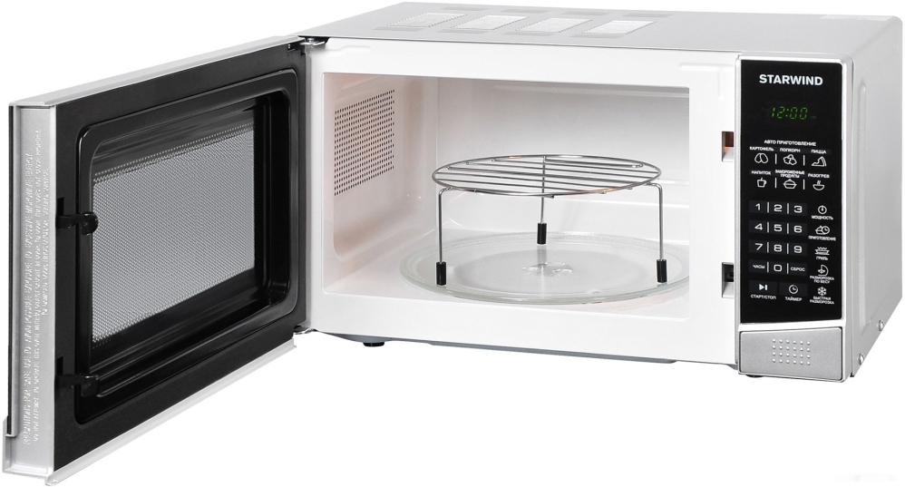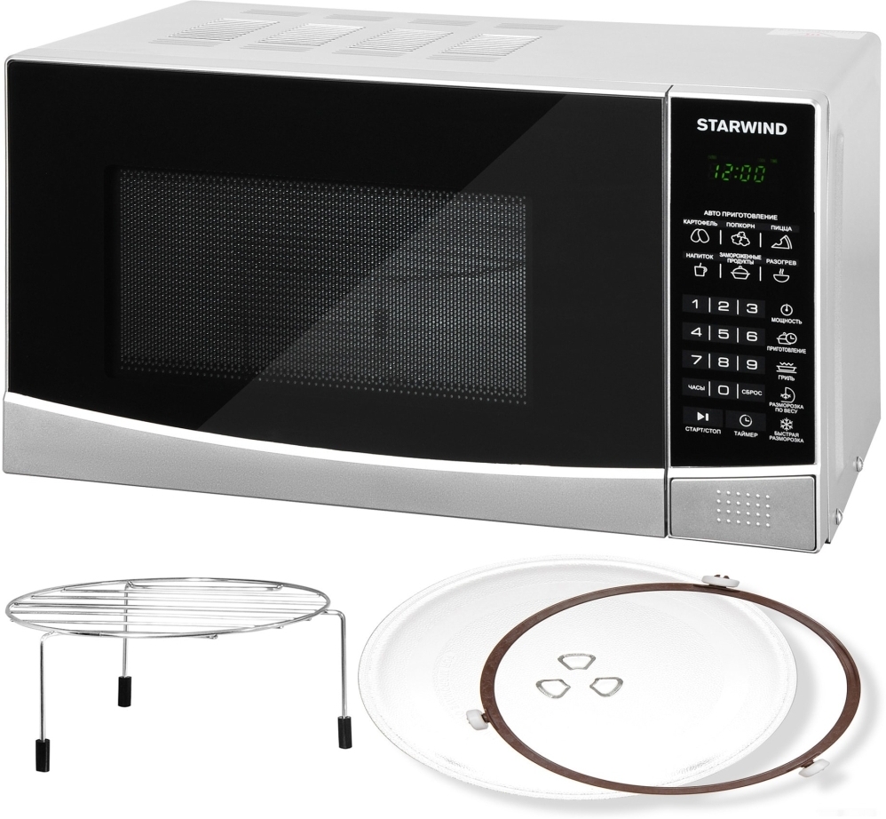 Отдельно стоящая, печь сВЧ+Гриль, объем 20 л, электронное управление, внутреннее покрытие эмаль, тип открывания дверцы кнопка, автоматическое приготовление, автоматическое размораживание, защита от детей, часы, ширина 45.2 см, цвет серебристый, черный.